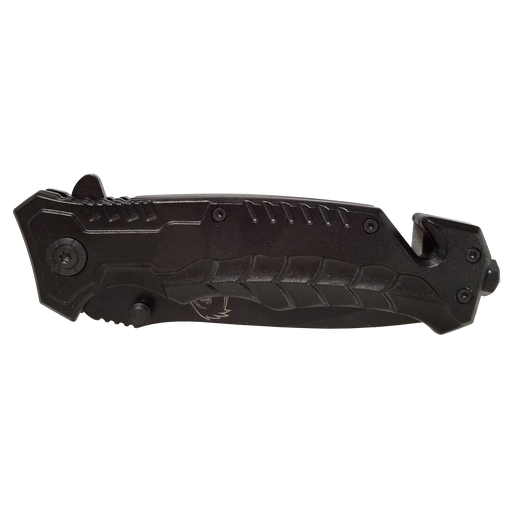 Minimum 50 440 stainless steel partially serrated blade. Spring assisted system. Heavy duty comfort grip metal handle with belt cutter and glass b...