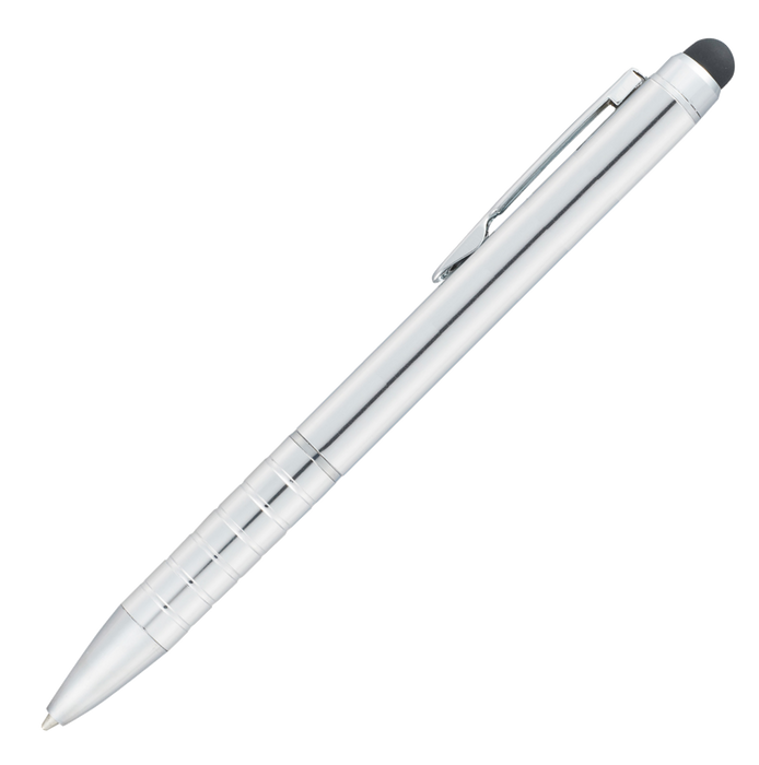The Preston Dual Ballpoint Stylus combines a classic ballpoint silhouette with the added stylus function. Grip is artfully textured with chrome rings. Retractable twist action mechanism with standard blue ballpoint ink cartridge.