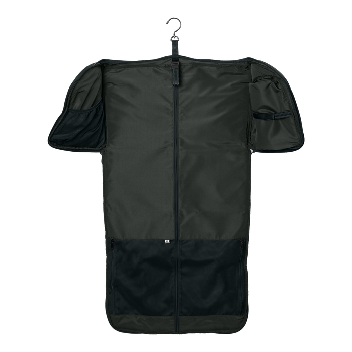 - When completely unzipped, garments hang neatly in main compartment