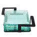 - Six clear glass square coasters in a black metal stand